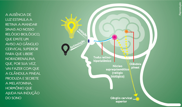 Melatonina: o hormônio do escurecerAo escurecer, a ausência de luz provoca modificação nas células da retina implicadas na percepção da variação na luminosidade e não da visão. Estas disparam sinais que são enviados para ativar o núcleo supraquiasmático. Este, por sua vez, faz com que o gânglio cervical superior libere o neurotransmissor noradrenalina que estimula a glândula pineal a produzir e secretar a melatonina a partir do aminoácido triptofano. "A melatonina é o hormônio responsável por sinalizar o início da noite e sua duração e, assim, iniciando uma cascata de eventos fisiológicos justamente para preparar o organismo para o repouso", salienta a professora.