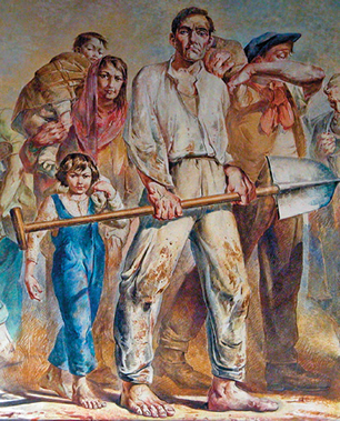 FAMÍLIA - Essa fundamentação aparece desde o primeiro quadro e na disposição não-cronológica. O painel no centro da composição mostra a chegada da família imigrante, com o homem à frente, empunhando uma pá expressando determinação e o olhar entre o cansaço, a apreensão e a consciência do desafio de construir o futuro diante do desconhecido.