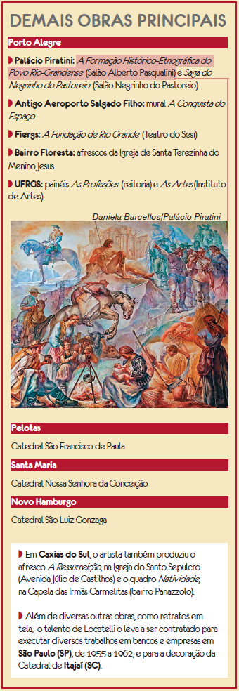 CONSAGRAÇÃO NO BRASIL - Interessada em resgatar a condição de referência cultural que a caracterizara no final do século XIX e início do século XX, Pelotas instala a Escola de Belas Artes em 1949, convidando Locatelli a se tornar o principal professor. No ano seguinte, o padre Eugênio Giordani contrata o artista para a decoração daquela que se constituiria em sua mais emblemática realização: a decoração da Igreja São Pelegrino.