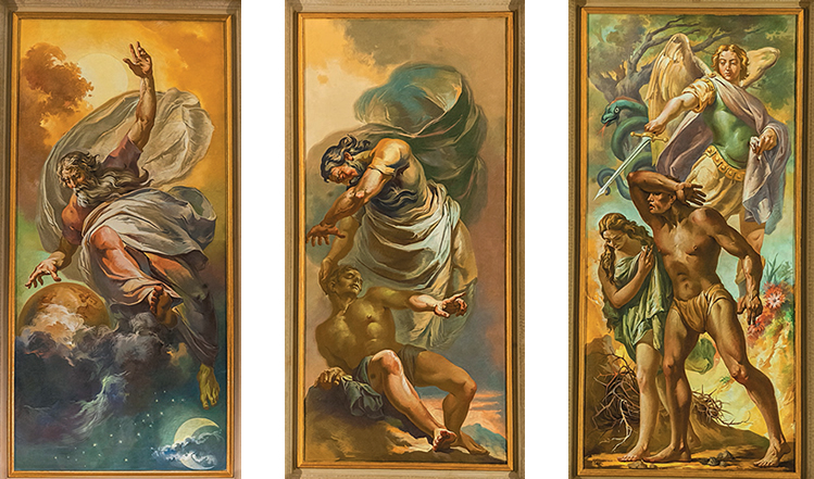 O segundo quadro é a Criação da Mulher (ao centro), na qual a figura feminina não aparece, e sim a sugestão de seu surgimento, com Adão semidesacordado aos pés de Deus. Segue-se a Expulsão do Paraíso (abaixo, à direita), com Adão e Eva em envergonhada retirada sob a ordem imposta pelo apontamento de uma espada por um anjo.