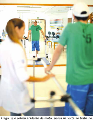 Tiago Cavazzola (foto à direita), de 24 anos, de Antônio Prado, após um acidente de moto, em março do ano passado, enfrenta, de forma tranquila, a sua adaptação a uma prótese na perna esquerda, além de exercícios no braço esquerdo que já passou por quatro cirurgias. Treino de marcha e equilíbrio estão entre as exercícios de reabilitação física desse jovem, que já analisa o retorno ao trabalho e a perspectiva para a compra de um carro. "Essa é a minha nova realidade. Além do bom atendimento que encontrei aqui na Clínica, tive a oportunidade de conhecer outras pessoas, com problemas parecidos com o meu", comenta Tiago.