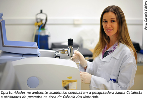 A determinação é uma das qualidades presentes na personalidade da pesquisadora Jadna Catafesta. Aos 20 anos, quando deixou São Marcos - seu município natal -, não imaginava que sua caminhada nos estudos seria ininterrupta. Na época, ela já havia cursado dois anos do curso de Engenharia Química, na UCS. Hoje, aos 32 anos, integra o quadro de professores do Programa de Pós-graduação em Engenharia e Ciência dos Materiais da Universidade. As oportunidades obtidas no ambiente acadêmico conduziram a então aluna Jadna a atividades de pesquisa desde os primeiros anos de sua graduação, quando atuou em projetos de iniciação científica. "No terceiro ano do curso fui bolsista na área de Física, logo após ingressei na área de Química e, no último ano, atuei na área de Materiais", conta a professora, que escolheu a graduação em Engenharia Química (concluída em 2004) por gostar de disciplinas exatas. Como resultado de suas experiências como bolsista, resolveu desenvolver o seu Trabalho de Conclusão de Curso (TCC) na área de Materiais. Inspirada pelo entusiasmo dos professores e orientadores, Jadna resolveu dar continuidade aos seus estudos. "Por conta desse incentivo, realizei o mestrado em Materiais, também na UCS, e depois, na UFRGS, o doutorado concluído em 2011, seguido de um pós-doutorado em Ciências dos Materiais, na França, na Université de Montpellier 2, com uma bolsa do Centre National de la Recherche Scientifique."