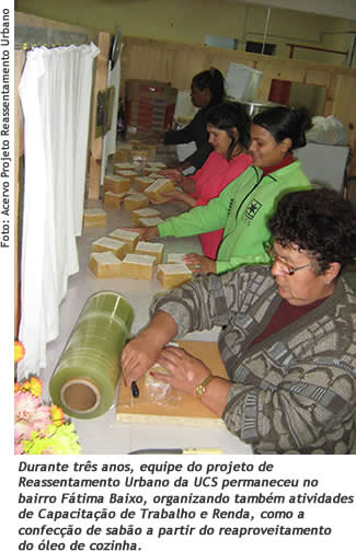 Essa opinião também é compartilhada por Valdir Pereira Neto, que hoje preside a Associação dos Moradores do Loteamento Victório Trez - o loteamento tem 120 apartamentos de dois quartos, 120 apartamentos de três quartos, 55 casas e 51 sobrados. "Os moradores, inicialmente, tiveram alguma resistência em sair do Fátima Baixo. Por isso foi muito importante a presença da equipe da Universidade, que cadastrou as famílias, conversou com cada uma delas, organizou diferentes comitês, fez com que todos entendessem a nova etapa da vida, de poder morar bem e aprender projetos novos, como, por exemplo, o de educação ambiental, com o reaproveitamento do óleo de cozinha, as oficinas de restauração de móveis, de biscuit ou de tear. A UCS ensinou a ter um trabalho, a ter uma nova renda", enfatiza. Comitês de Monitoramento e Acompanhamento de Obras; de Capacitação de Trabalho e Renda; de Educação e Cultura; de Desenvolvimento da Consciência e Práticas Ambientais; de Saúde, Esporte e Lazer; e de Comunicação Comunitária foram implantados pela UCS durante o trabalho de reassentamento.