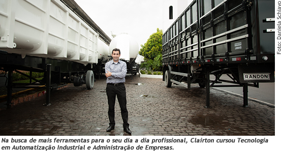 A vida profissional de Clairton se iniciou cedo, aos 17 anos, logo após concluir o curso de Eletricista Geral de Manutenção, no Serviço Nacional da Indústria (Senai). Uma breve passagem por uma empresa de produção de máquinas para a indústria petroquímica foi o impulso para o seu despertar profissional. "No final da experiência, fui convidado para integrar a equipe de manutenção da Randon", conta o executivo que ficou mais de 15 anos nessa área. Durante esse período, ele percebeu a importância de adquirir novos conhecimentos. "Prestei vestibular para o curso de Engenharia Mecânica e, após alguns semestres, fiz reopção para Automatização Industrial", recorda. Apenas um curso de graduação não foi o suficiente para Clairton, que buscou na Administração de Empresas mais ferramentas para o seu dia a dia profissional. "Utilizo, na gerência dos processos diários, o conhecimento da minha segunda graduação." A sua experiência aliada ao interesse em profissionalizar-se fez com que, em 2005, fosse promovido a coordenador da Ferramentaria, uma das áreas de tecnologia e inovação do grupo Randon.