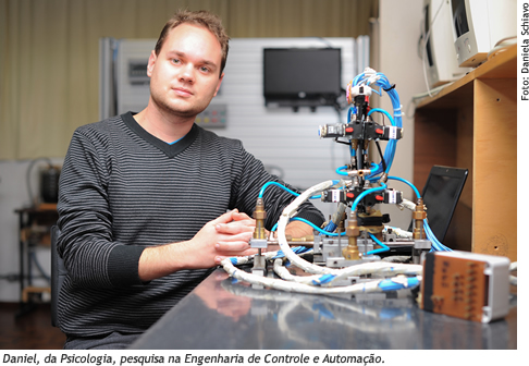 A integração entre diferentes áreas do conhecimento e o conceito de transdisciplinaridade - que visa a unidade do conhecimento - está bem representada na atividade desenvolvida por Daniel Müller da Silva, 23 anos. O aluno de Psicologia atua como bolsista de Iniciação Científica no curso de Engenharia de Controle e Automação, desenvolvendo pesquisas sobre Inteligência e Consciência Artificial. A Consciência Artificial é um campo da Inteligência Artifical (AI) que trabalha integrando conhecimentos para a criação de uma consciência em robôs ou em Sistemas Cognitivos Autonômos. Os estudos nessa área podem ser aplicados na robótica e telecomunicação na otimização de processos. Daniel também trabalha com antigos paradigmas, como: será possível um robô se tornar consciente? Segundo o acadêmico, sim! "Mas para isso temos que trabalhar em outras áreas do conhecimento, como, por exemplo, a Neurociência, que é uma ciência nova e que está trazendo grandes contribuições para outras áreas, como a Linguística, a Medicina, a Psicologia e as Engenharias na modelagem de sistemas cognitivos artificiais."