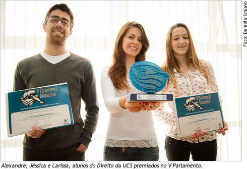 Jéssica enfatiza a alegria pela premiação ao trabalho, principalmente "quando se discutem as questões ambientais e essas discussões se concretizam e são reconhecidas na prática". Para Alexandre, a elaboração do projeto de lei o fez despertar pelo interesse às questões ambientais e aprofundar o conhecimento sobre a legislação voltada à área. "O evento me agregou valor e fez com que eu pudesse desenvolver minha forma de pensar diante do projeto de lei." A outra autora, Larissa Wegner Cezar, diz que a premiação "é uma forma de concretiza- Alexandre, Jéssica e Larissa, alunos do Direito da UCS premiados no V Parlamento ção do estudo realizado. Foi um ótimo aprendizado poder participar do processo legislativo". O Parlamento Ambiental, que também contou com a participação de projetos de lei de alunos de outras instituições de Ensino Superior, teve como tema "A legislação ambiental garantindo a sustentabilidade da nossa cidade."
