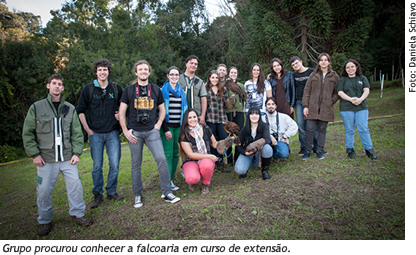 Um grupo de 10 acadêmicos do curso de Ciências Biológicas teve a oportunidade de conhecer de perto a falcoaria, a arte de criar, treinar e cuidar de falcões e outras aves de rapina para a caça. No Brasil, a falcoaria é utilizada em aeroportos e para o controle de pombos domésticos e outras espécies consideradas pragas. Os alunos da UCS participaram, em junho, de um curso de extensão realizado na Cidade Universitária, em Caxias do Sul. Nesse curso, ministrado pela Hayabusa Falcoaria e Consultoria Ambiental, de Porto Alegre, foram abordados assuntos como a reabilitação, soltura e conservação de rapinantes. Os participantes conheceram mais sobre a história, a ecologia, o manejo, a saúde (higiene, doenças e prevenção), o treinamento, o condicionamento e as áreas de atuação do profissional que treina os falcões. De acordo com Gustavo Trainini, um dos ministrantes da atividade, o objetivo de treinar os falcões é que esses animais afastam outras aves de determinados locais. "A função do falcão é tornar esses locais impróprios, fazendo com que os outros animais 'pensem' que tal região é um local de caça", explica. Hoje essa prática é utilizada nos aeroportos de Porto Alegre, do Rio de Janeiro, de Belo Horizonte, Joinville e Belém.