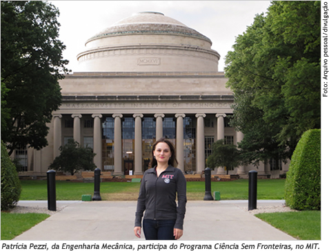 A aluna do terceiro semestre do curso de Engenharia Mecânica Patrícia Angélica Pasa Pezzi, 27 anos, é uma das acadêmicas que participa dos Programas de Mobilidade Acadêmica Internacional mantidos pela UCS. Ela foi selecionada, no ano passado, para o Programa Ciência Sem Fronteiras, do governo federal, para estudar na Universidade de Massachusetts - Dartmouth (UMassD), na cidade de Dartmouth, no estado de Massachusetts, Estados Unidos, onde permaneceu de setembro a dezembro de 2012. Hoje, ela continua participando do Programa, mas no Massachusetts Institute of Technology (MIT), em Cambridge, na região metropolitana de Boston. Para a Revista da UCS, Patrícia contou como é estudar na instituição que é referência mundial em Ciência e Tecnologia, berço de 78 ganhadores do Prêmio Nobel. Logo no seu primeiro mês de MIT, após ter dormido apenas seis horas em três dias para concluir um trabalho de aula, a acadêmica conversava com seu professor de Cálculo, Terrence Blackman, a respeito do ritmo das atividades na universidade. "Questionei se seria sempre assim. Ele respondeu: 'Bem... estudando aqui você vai perceber que as pessoas superestimam a necessidade de comida e sono. Você também se acostuma.' Ele estava certo, você realmente aprende a trabalhar com menos horas de sono e, às vezes, não percebe que pula uma refeição ou outra", reconhece.