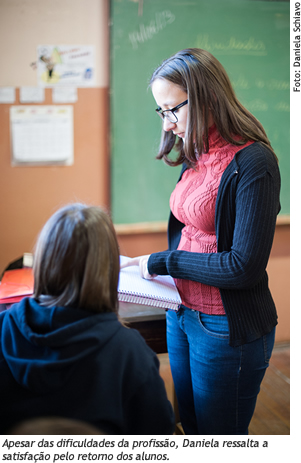 Daniela está dando os primeiros passos como professora, mas já tem uma opinião consistente sobre a profissão. "Ser professor não é apenas uma profissão, mas um compromisso de educar e construir novas culturas. Há muito o professor deixou de ser o "transmissor" do conhecimento para ser um educador. Acima de tudo, ele é o instrumento primordial na construção de uma nova sociedade, mais humana e igualitária, com suas bases em uma educação sólida e de qualidade. Para ser professor é preciso querer ensinar, mas também estar disposto a aprender", destaca. Para quem está pensando em cursar uma Licenciatura, Daniela afirma que não é uma profissão fácil e que a classe ainda sofre com a baixa remuneração e o acúmulo de trabalho. No entanto, é muito recompensadora. "A experiência de estar em sala de aula é única em cada turma. Cada aula é diferente, mesmo que o planejamento seja o mesmo, pois os alunos reagem de formas diferentes. E isso é muito interessante, pois nunca caímos na rotina e o retorno que cada aluno pode trazer é especial. Além disso, a escola é um local incrível, pois ali circulam conhecimentos de todos os tipos."
