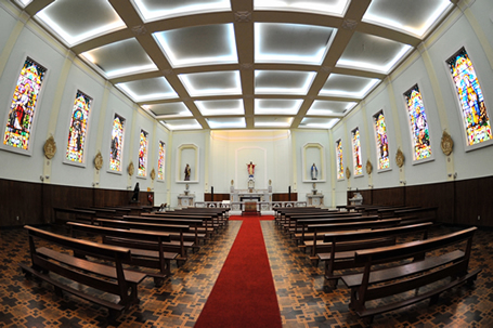 Uma das atrações do Centro de Artes e Arquitetura, no Campus 8 - Cidade das Artes, além do conjunto arquitetônico concluído no final da década de 50, é a Capela Santa Francisca Xavier Cabrini, que sediava a parte religiosa do Colégio Cabrini. A construção da Capela começou em agosto de 1958. A estrutura simples é valorizada por detalhes que são verdadeiras obras de arte. Os vitrôs, com grandes imagens de santos, idealizados pelas próprias irmãs, resultam na combinação perfeita de traços e tons que garantem luminosidade ao local. O prédio da capela, em estilo pré-modernista, foi concluído em fevereiro de 1962. A foto é de Daniela Schiavo.